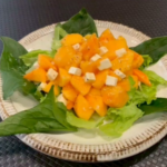 ④混ぜたものを、柿とチーズの上にかけて、混ぜて、お好みのベビーリーフなどグリーン野菜の上にのせます。
